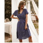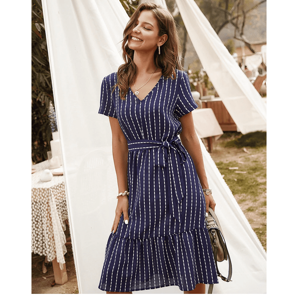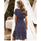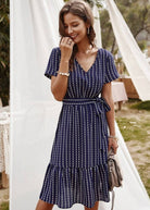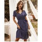 بلون أزرق داكن، وياقة على شكل V وحزام مربوط، يعكس هذا الفستان القصير روح الهيبي الشيك بشكل مثالي. تصميمه غير المتناظر يضيف لمسة عصرية بشكل رقيق. مثالي لليلة رومانسية أو هروب صيفي.