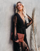 Αυτή η μακριά μαύρη φορεσιά με κεντήματα γοητεύει με τις λεπτομέρειες της και την V λαιμόκοψη που αναδεικνύει το πρόσωπο. Η ροή της γραμμής της επιμηκύνει τη σιλουέτα και τονίζει τη θηλυκότητα με σύγχρονο τρόπο. Ιδανική για καλοκαιρινές ημέρες και για κομψές βραδιές, συνδυάζει άνεση και εκλεπτυσμένη κομψότητα σε κάθε περίσταση.