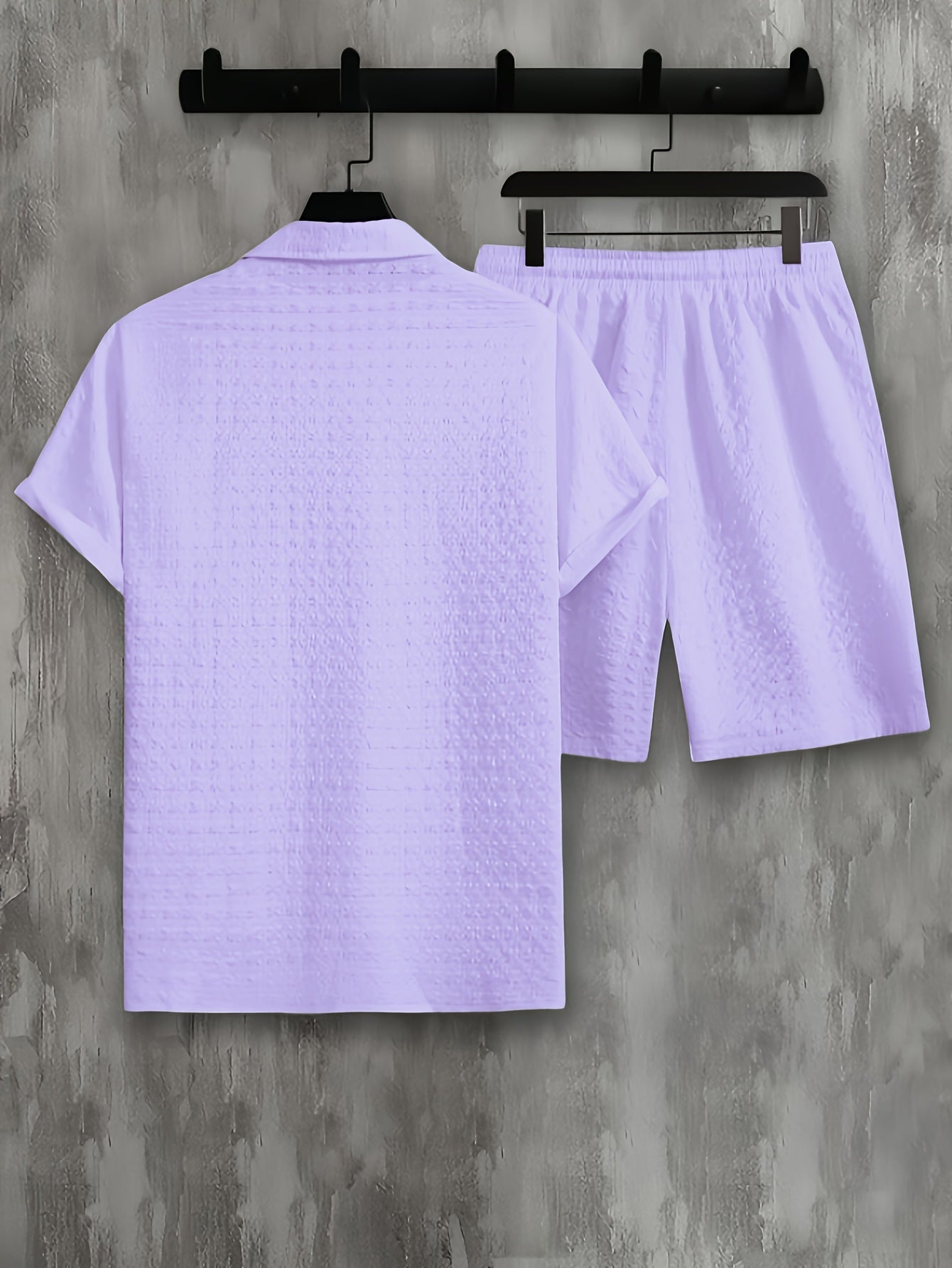 Αυτή η σύνθεση συνδυάζει ένα κοντομάνικο πουκάμισο με κουμπιά και ένα σορτς με ρυθμιζόμενο κορδόνι. Προσφέρει χαλαρή εφαρμογή για μέγιστη άνεση. Ιδανικό για διάφορες περιστάσεις, συνδυάζει στυλ και πρακτικότητα.