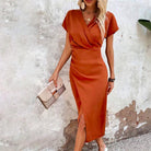 Αυτή η μίντι φόρεμα προσφέρει μια κολακευτική γραμμή με το V ντεκολτέ και τα κοντά μανίκια της. Η ζεστή απόχρωσή της και η διακριτική σχισμή προσθέτουν μια πινελιά κομψότητας.