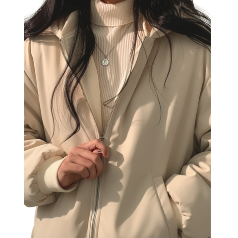 Αυτή η μπουφάν ξεχωρίζει για τον αναστρέψιμο σχεδιασμό της, προσφέροντας μια ανοιχτό γκρι πλευρά με ομαλή οπτική εμφάνιση και μια ελεφαντί πλευρά με πιο όγκο. Κάθε πλευρά προσφέρει διαφορετική εμφάνιση: η μία για ένα απλό στυλ, η άλλη για μια πιο περιποιημένη και υφή εμφάνιση. Η κοντή κοπή της, η ενσωματωμένη κουκούλα και ο γενναιόδωρος όγκος την καθιστούν ιδανικό κομμάτι για τις κρύες μέρες όπου θέλετε να ποικίλετε την εμφάνισή σας χωρίς να αλλάξετε ρούχα.