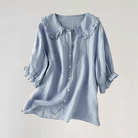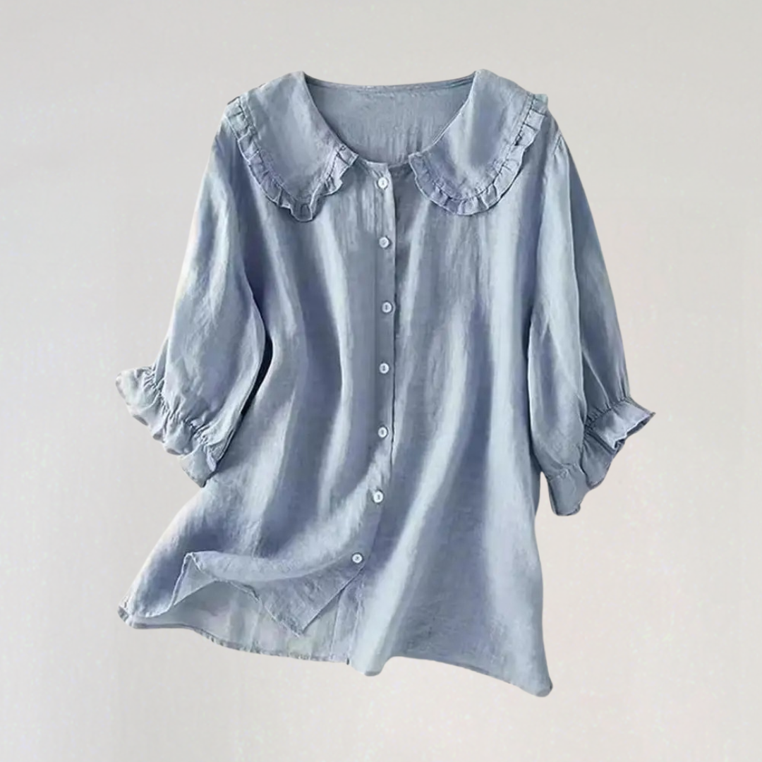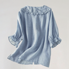 This lightweight shirt features an elegant ruffled collar and three-quarter sleeves for a relaxed summer style. Its loose fit ensures optimal comfort throughout the day. Perfect for various occasions, it easily pairs with different bottoms.