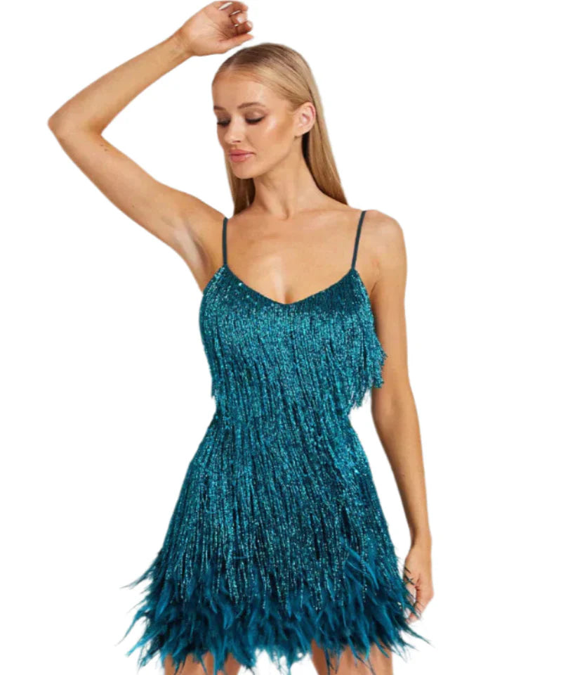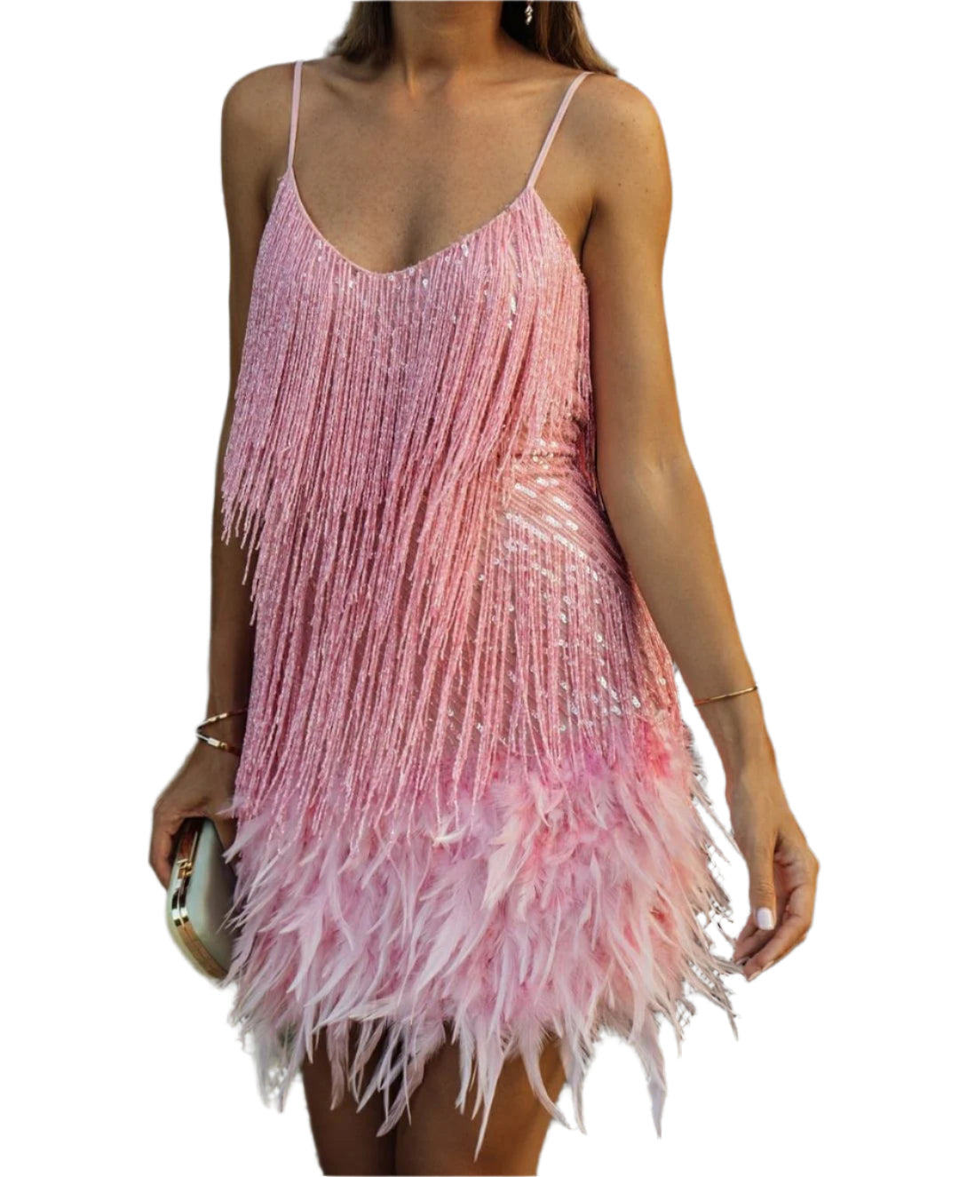 Clarisse | Mini Glamour - Mekko, jossa on Hapsuja ja Höyheniä