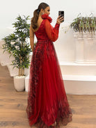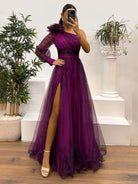 Cette robe longue présente un motif floral unique. Son design à une épaule et sa fente latérale ajoutent une touche d'élégance.