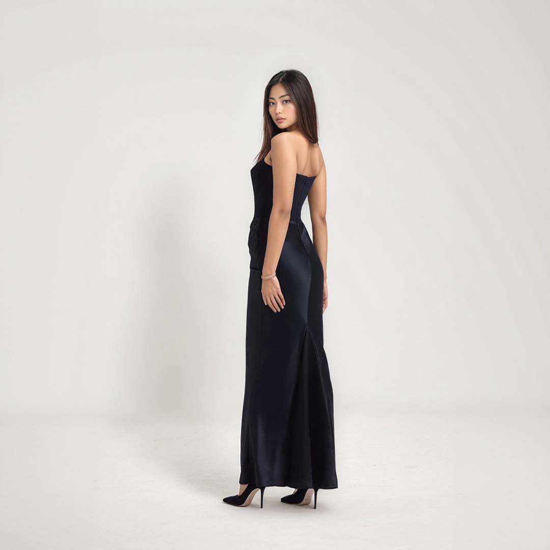 Cette robe corset élégante met en valeur la silhouette grâce à son haut structuré. Son design sans bretelles et sa coupe fluide apportent une touche de sophistication naturelle. Idéale pour les soirées habillées et les occasions formelles.