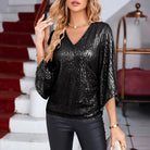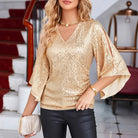החולצה הזו מדגישה את הסילואט עם הצווארון בצורת V המעודן והשרוולים המתרחבים הנופלים בחן. הפייטים המנצנצים מוסיפים נגיעה של זוהר עדין למראה שלכם. אידיאלית לערבים או לאירועים מיוחדים, היא משלבת סגנון מתוחכם ונוחות מוחלטת.