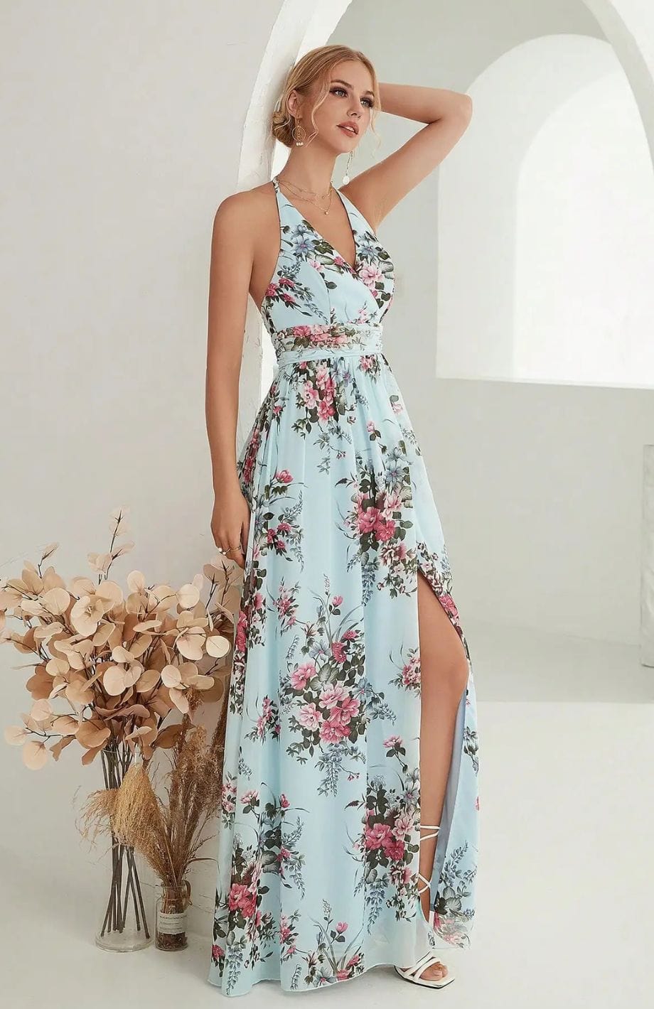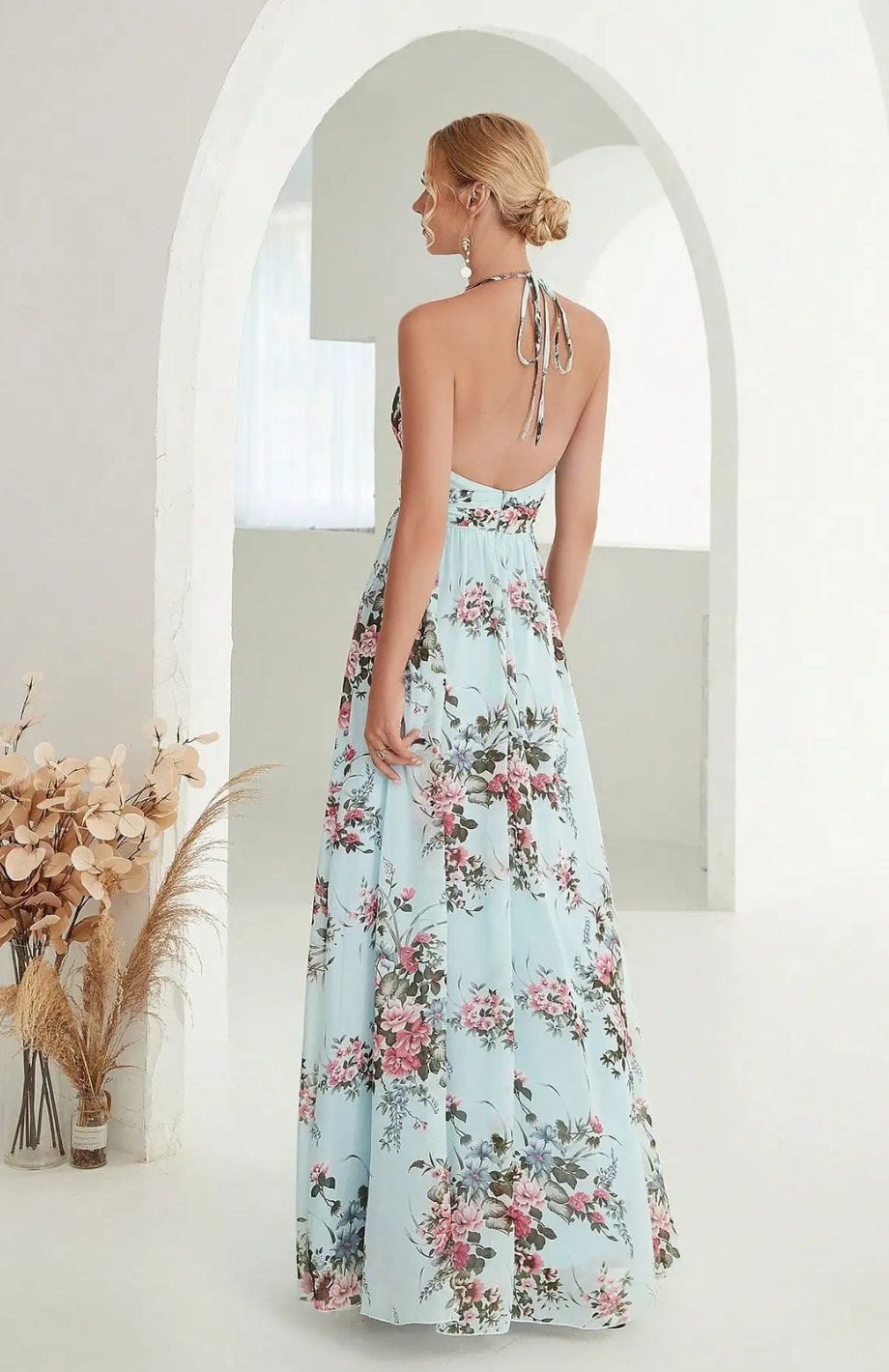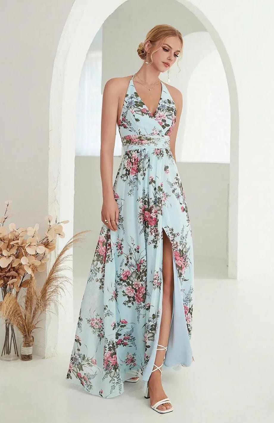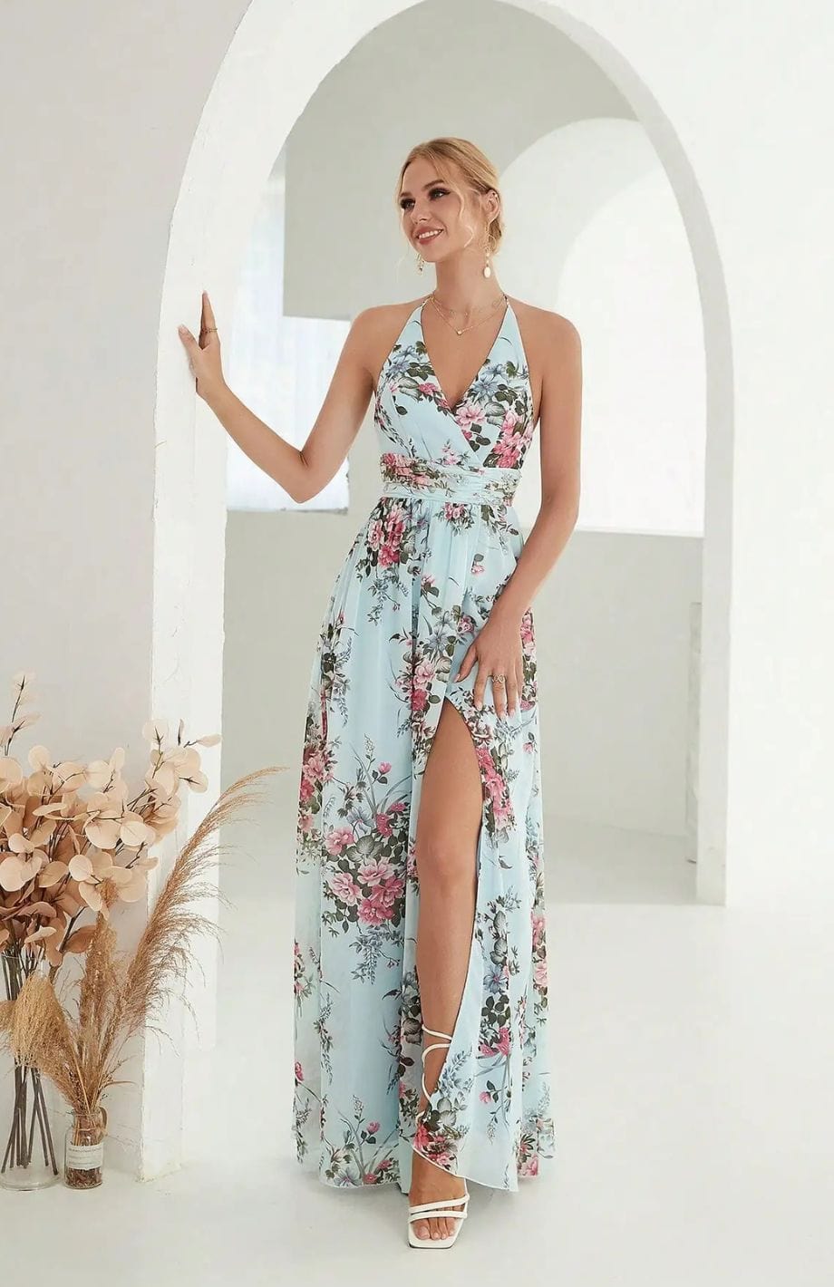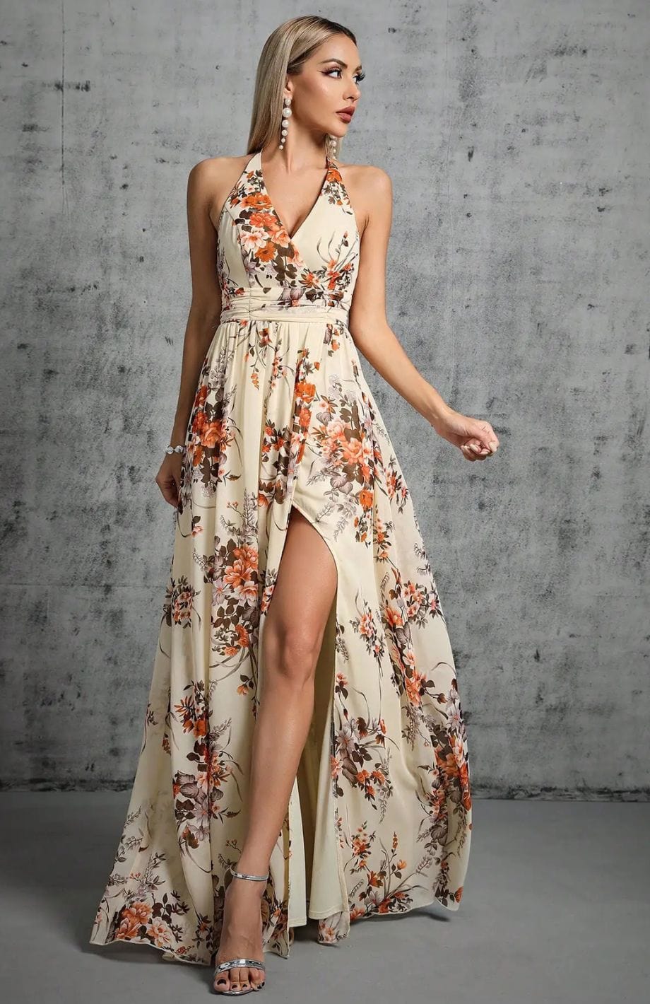 השמלה הארוכה והזורמת הזו מושלמת עבור חתונות כפריות. הצווארון שלה בצורת V והמותן המודגשת מדגישים את הסילואט. השרוולים הקצרים והמרחפים מוסיפים נופך קלילות.