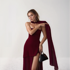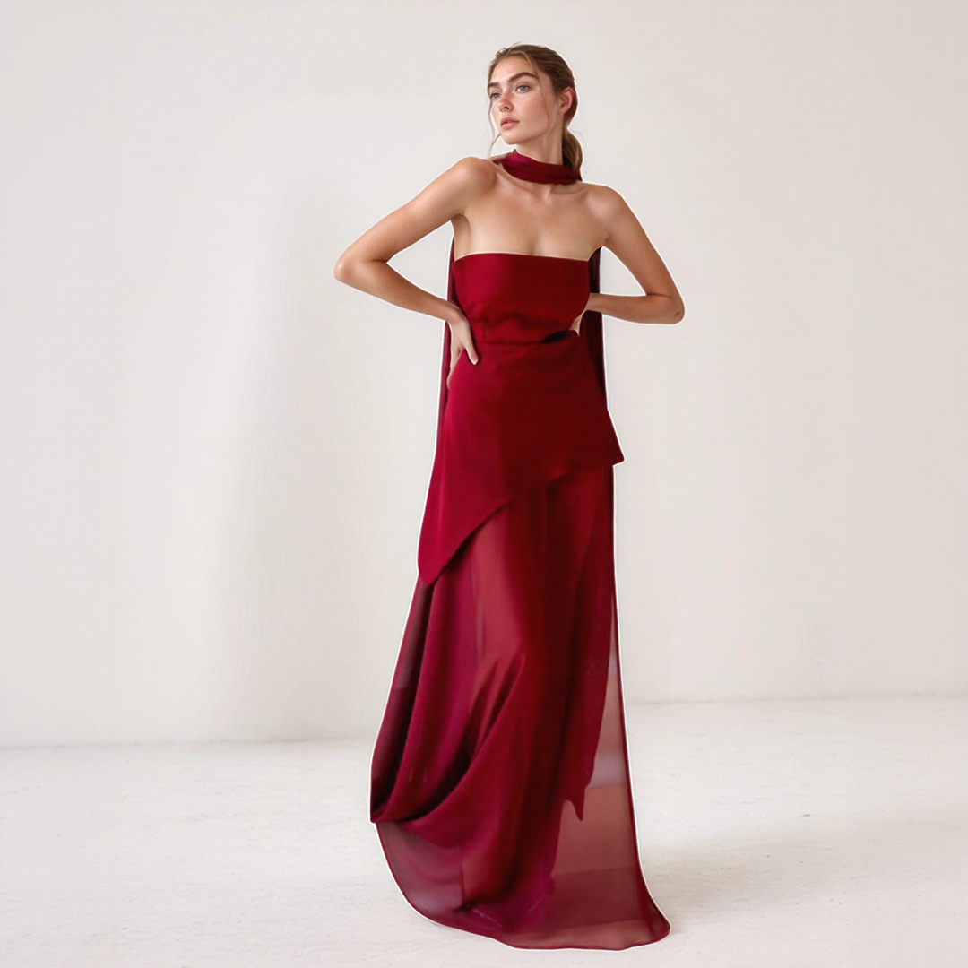 Nelly | Hosszú Elegáns Ruha – Aszimmetrikus Kivágás és Beépített Sál