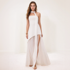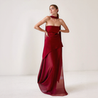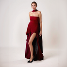 Ez a hosszú elegáns ruha aszimmetrikus szabással rendelkezik, amely magas-alacsony szegéllyel és átlapolással mélységet és mozgást ad. Az integrált sál részlet finoman körbefonja a nyakat, vagy a vállra terül, hogy kifinomult befejezést adjon. Könnyű anyagból készült, amely folyékony és kényelmes sziluettet biztosít.