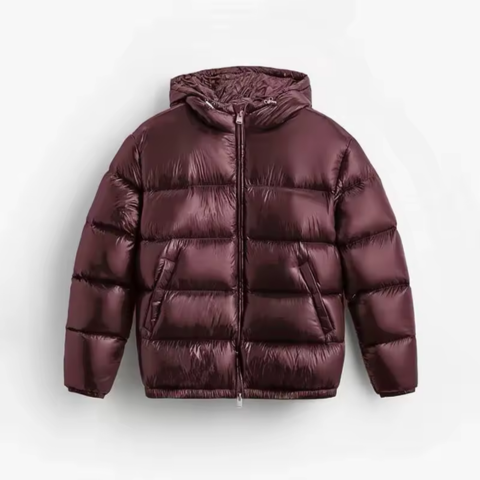 アレクシス | メンズショートダウンジャケット — フード付きと光沢仕上げ