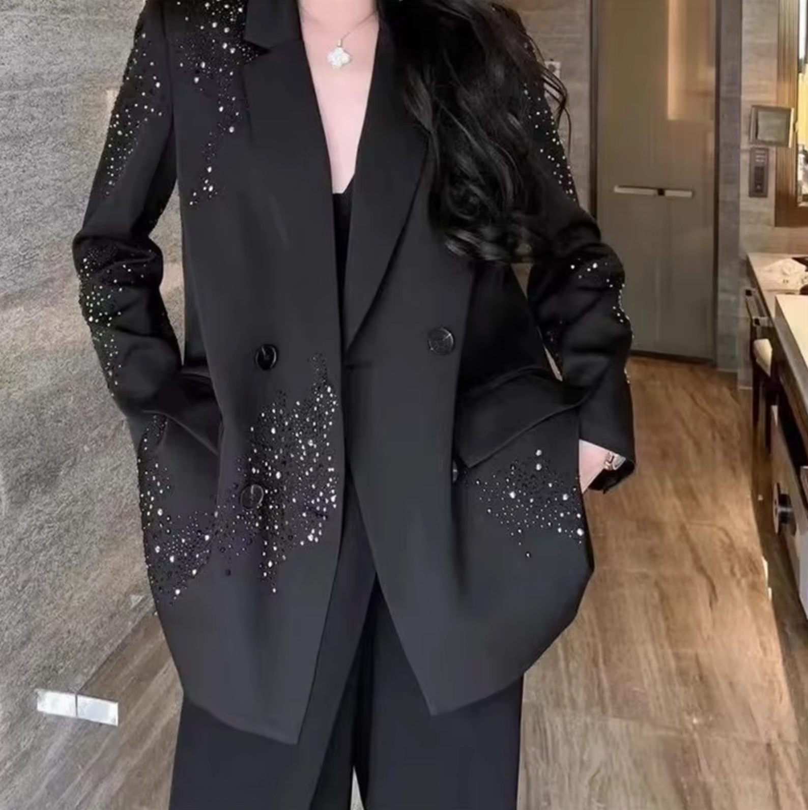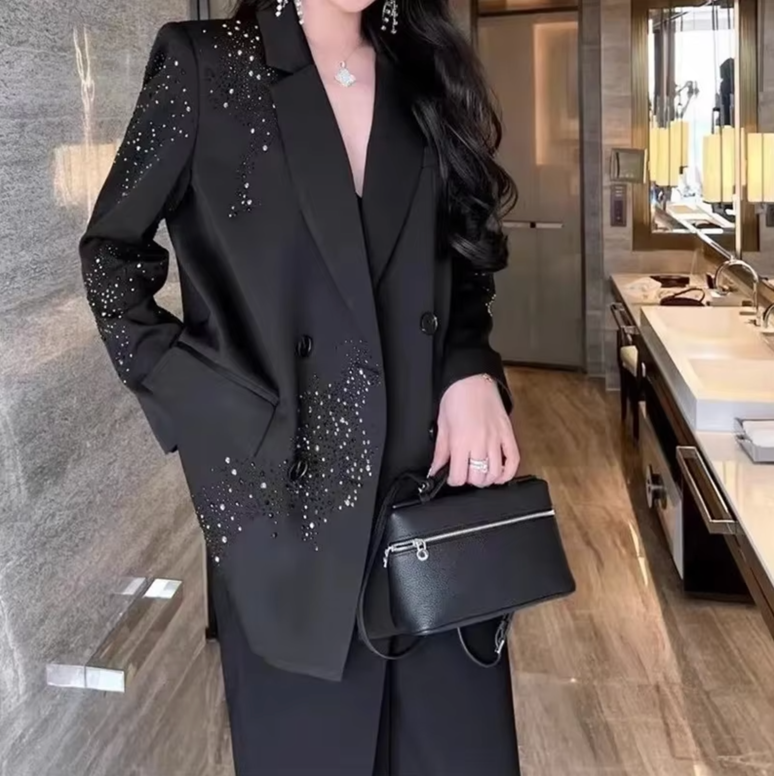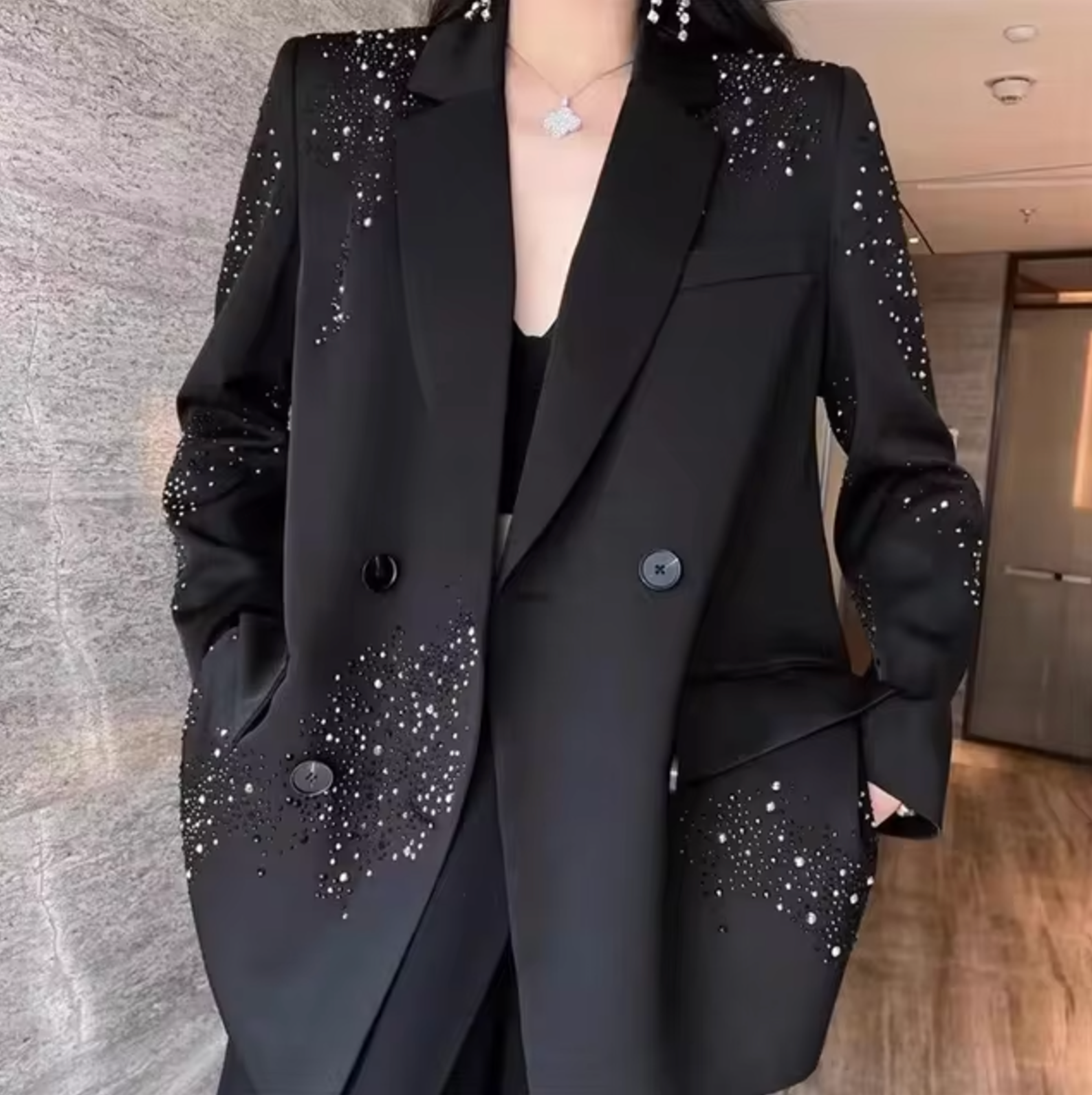 この黒いジャケットは、繊細な輝きを添えた現代的なエレガンスを体現しています。きらめくディテールがあなたのスタイルに洗練された印象を与え、決して過剰になりません。シックな夜や洗練されたプロフェッショナルなルックに最適で、控えめさと輝きを兼ね備えています。