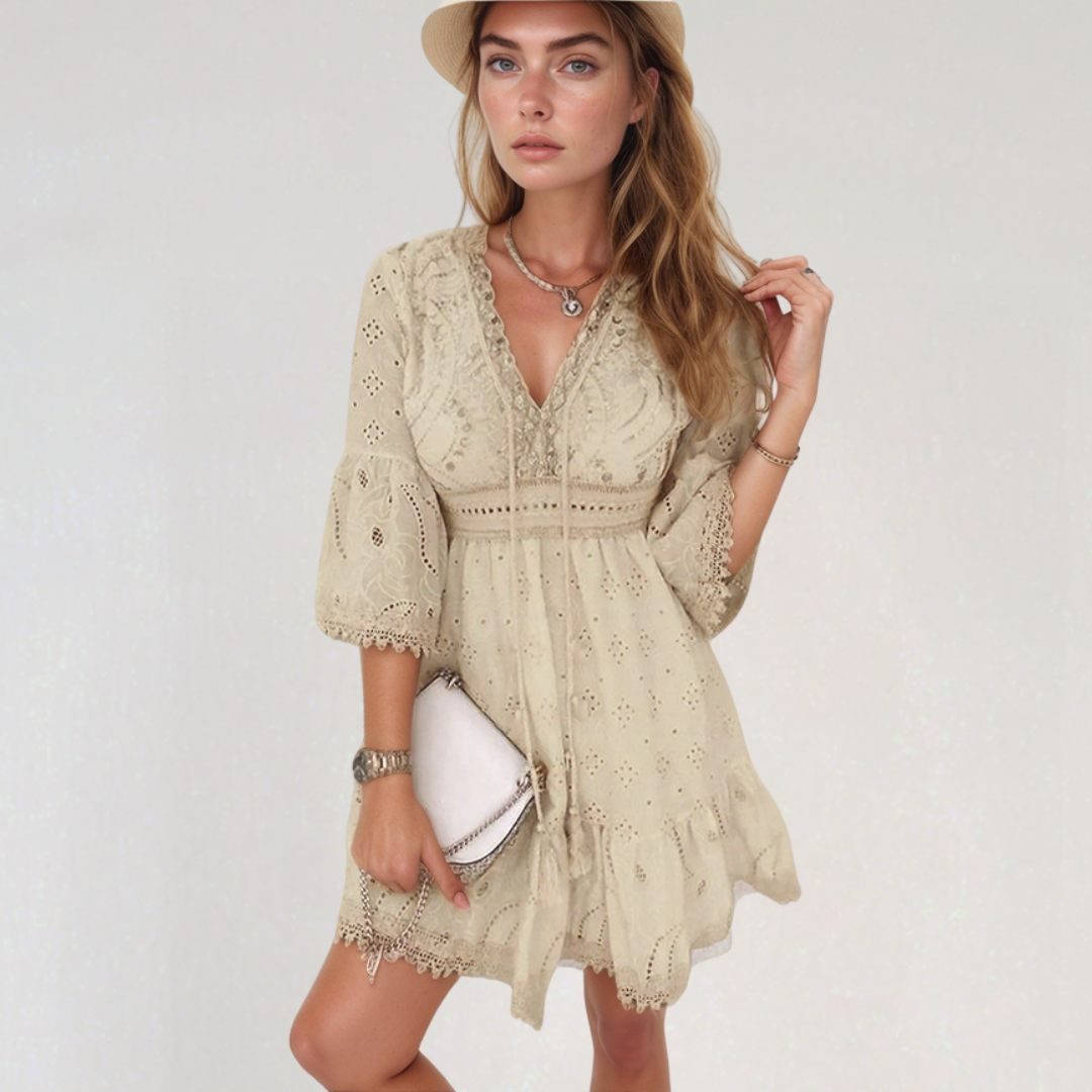 ジスレーヌ | ボヘミアンショートドレス – 繊細な刺繍とVネック