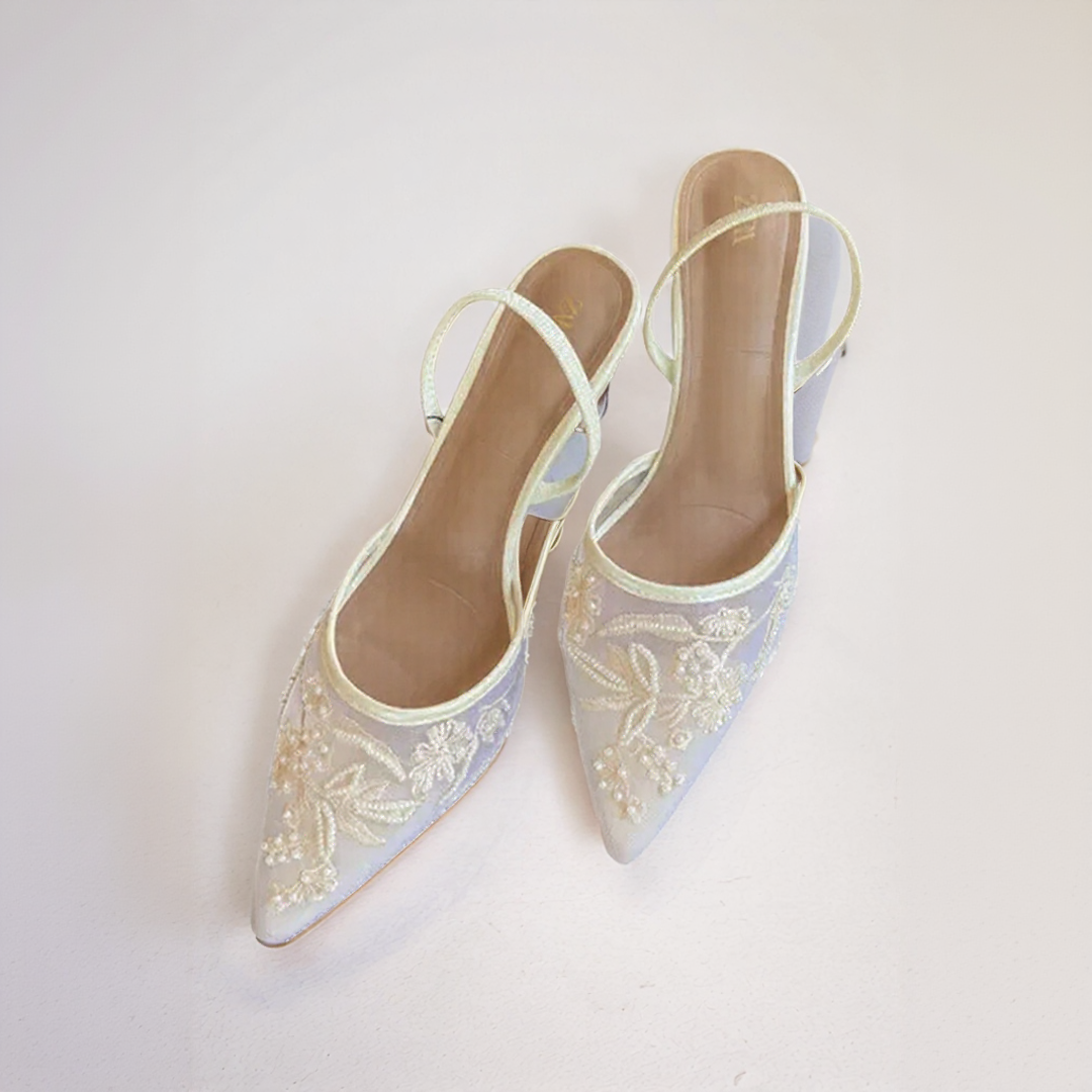 Disse høye skoene skiller seg ut med en delikat blomsterbroderi på en solid, lett og gjennomsiktig overdel. Deres spisse tå forlenger silhuetten med eleganse, mens den justerbare stroppen sikrer et trygt hold samtidig som den tilfører et preg av raffinement.