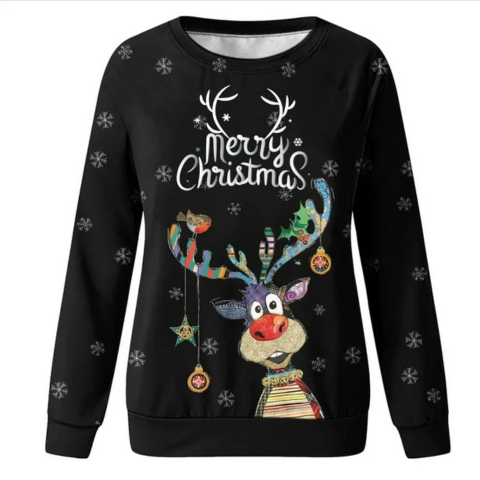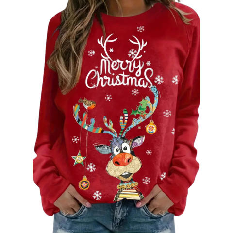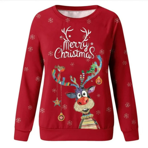 Denne genseren fremhever et reinsdyr illustrert i en glad og fargerik stil. Snøfnuggene og dekorasjonene gir et visuelt preg som minner om den varme ånden i sesongen. Lett å bruke til hverdags, den tilfører et lekent element til alle antrekk for slutten av året.