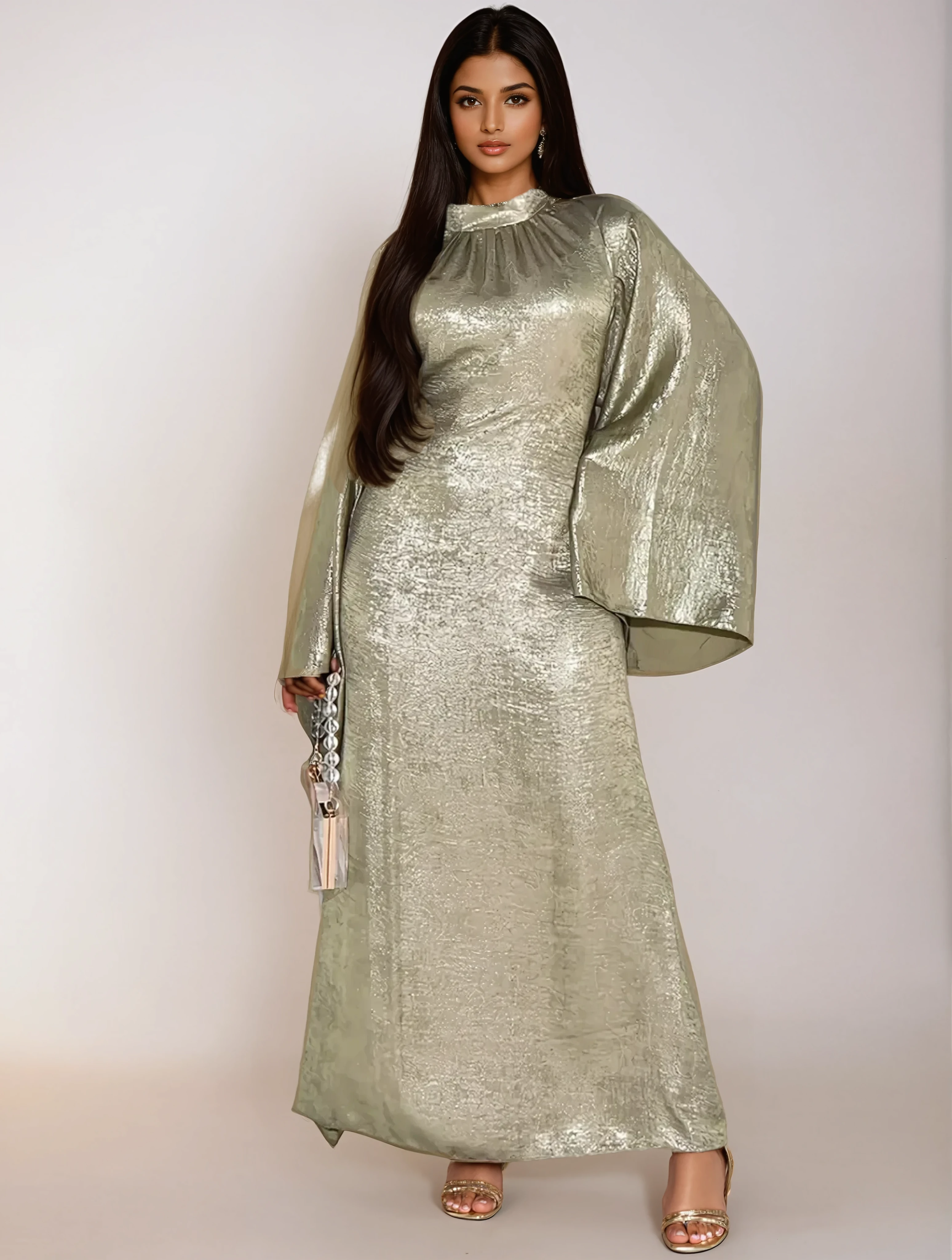 • Escote alto y mangas acampanadas para una elegancia discreta