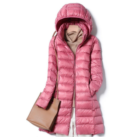 Tento dlhý páperový kabát ponúka obklopujúce teplo, pričom zostáva ľahký a elegantný.