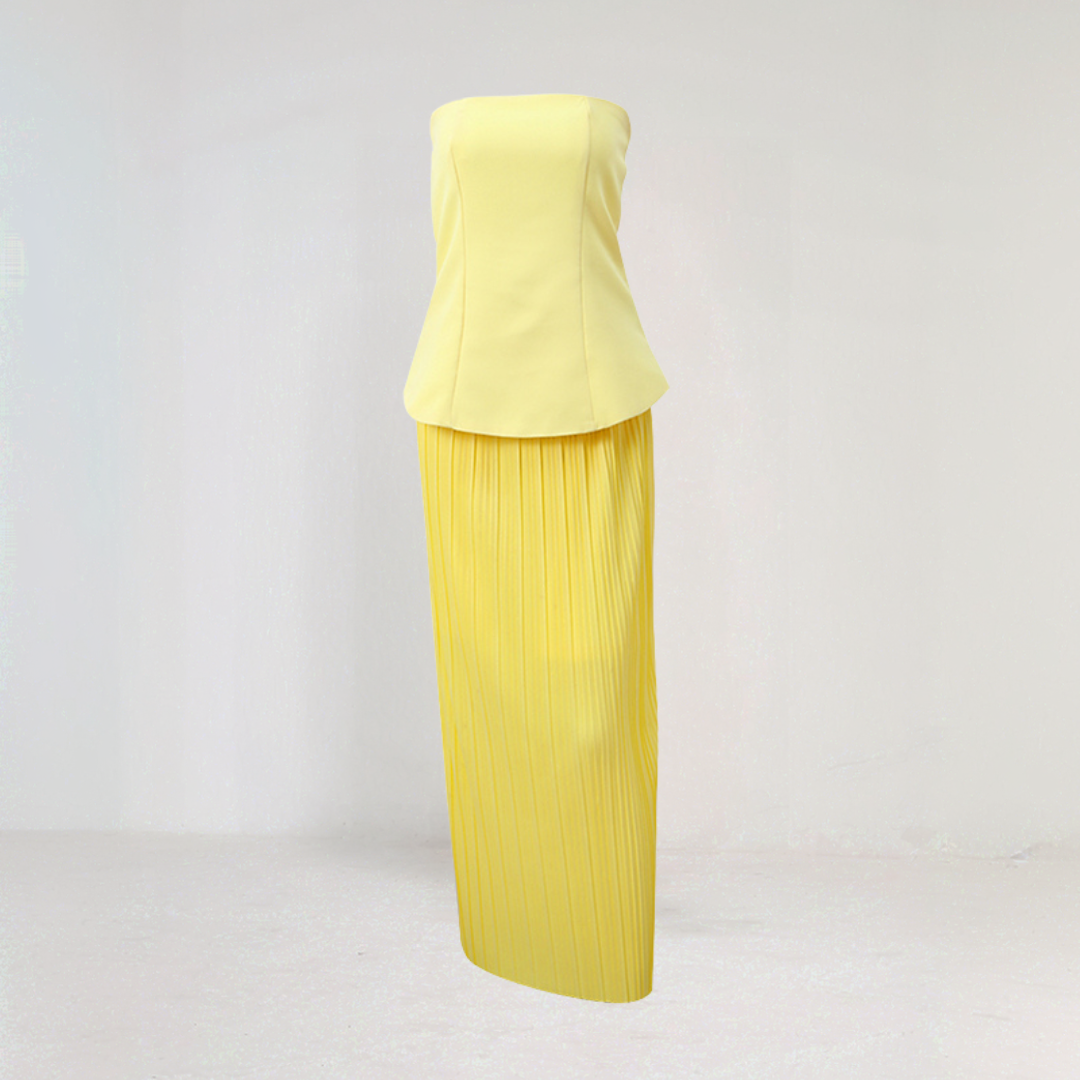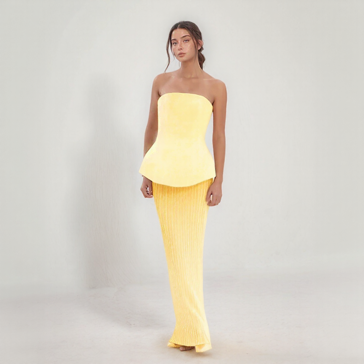 Tento set spája crop top bez ramienok, ktorý zvýrazňuje plecia, s dlhou plisovanou sukňou s voľným padaním. Ideálne na elegantné príležitosti, spája moderný rafinovaný vzhľad a pohodlie po celý deň.