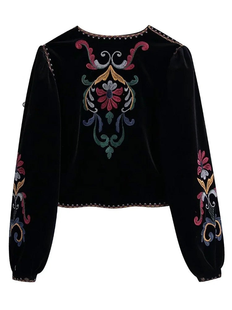 Denna korta jacka med blommönster förkroppsligar en feminin stil full av charm och karaktär. Dess färgglada mönster framträder mot en djup svart bakgrund, vilket skapar en subtil och harmonisk kontrast. Lätt och behaglig att bära, passar den lätt med olika outfits för en både modern och raffinerad stil.